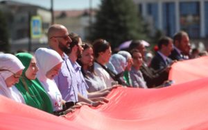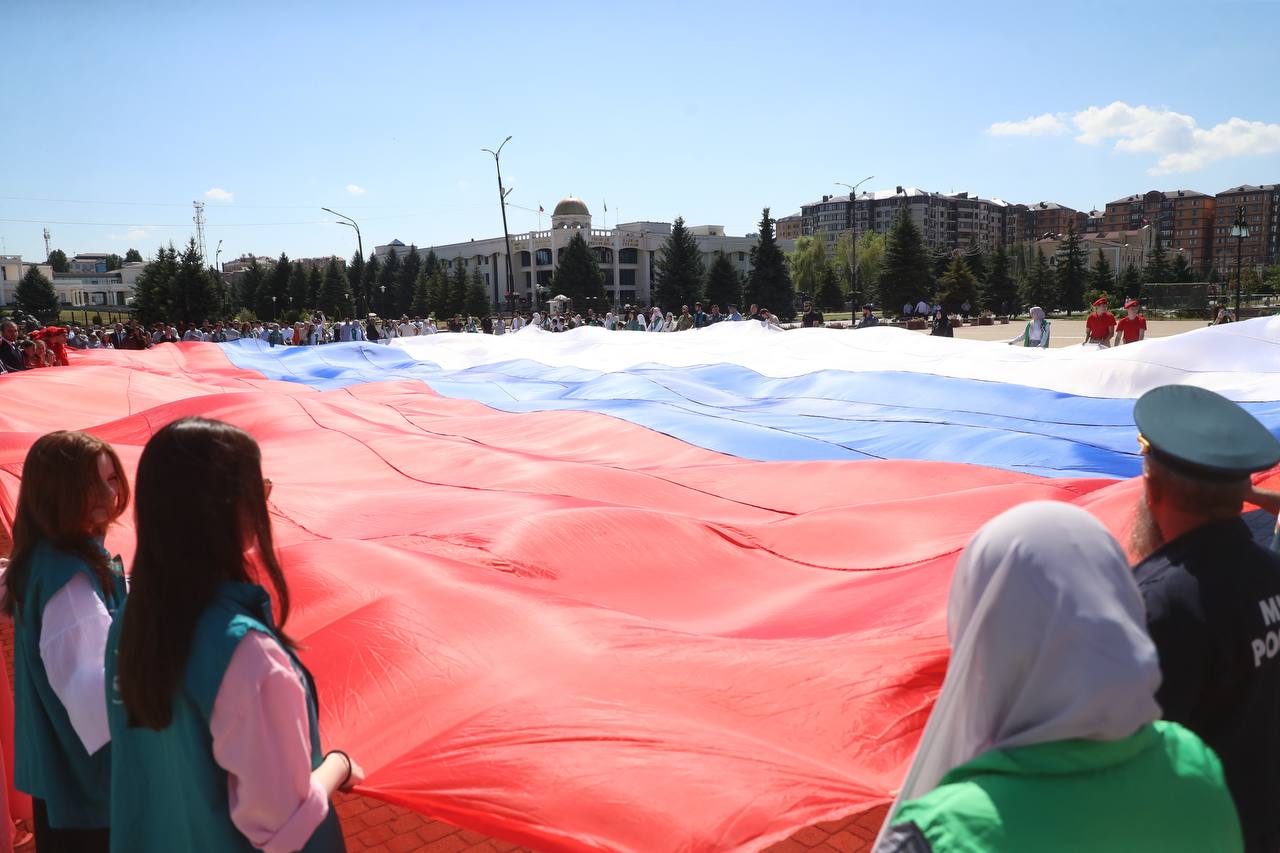 Главным событием стало развертывание огромного полотна российского триколора площадью 600 квадратных метров, в котором приняла участие Министр культуры Республики Ингушетия Залина Льянова.