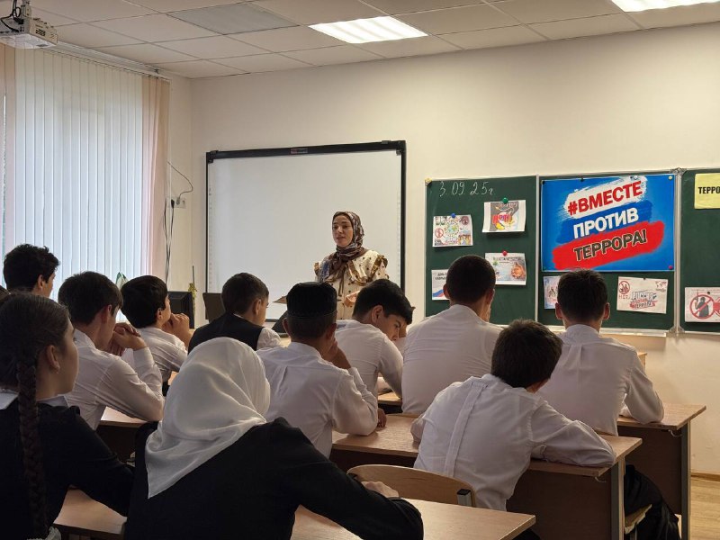 3 сентября, в День солидарности в борьбе с терроризмом, сотрудник Мемориального комплекса жертвам репрессий Асет Аушева провела урок с элементами тренинга под названием «Терроризм- угроза обществу» в 9-ых классах ГБОУ «СОШ №8 г.Назрань.